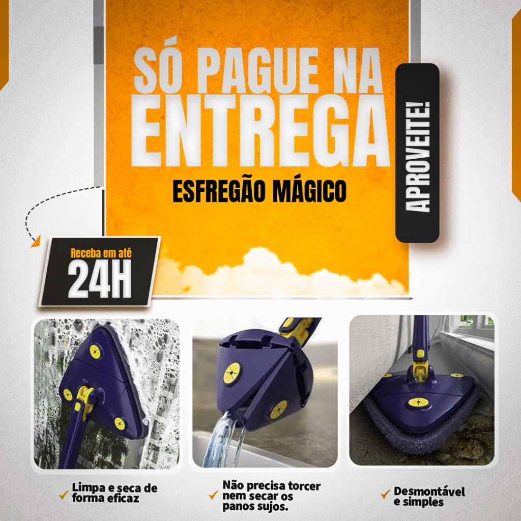 O grande segredo é que esse esfregão gira 360 graus e tem o formato de um triângulo. Assim, você consegue limpar cada cantinho da casa e limpa toda a sujeira.